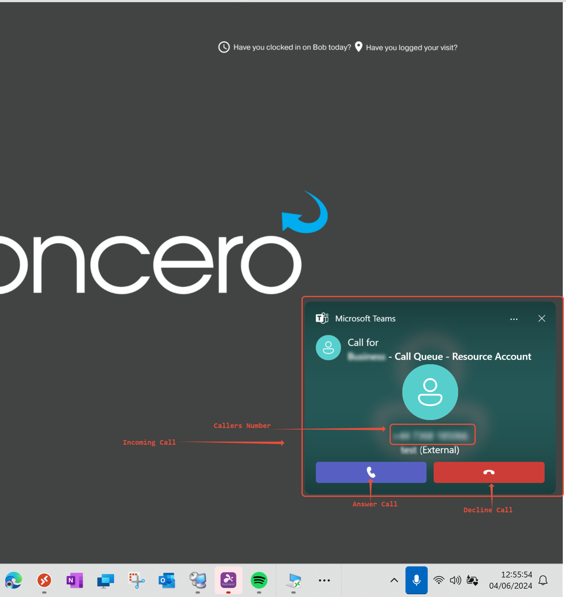1) A call will appear in the bottom right corner of your screen, it will show the number or unknown if the number is hidden. In the box, you get the option to answer with the box on the left or decline with the box on the right.