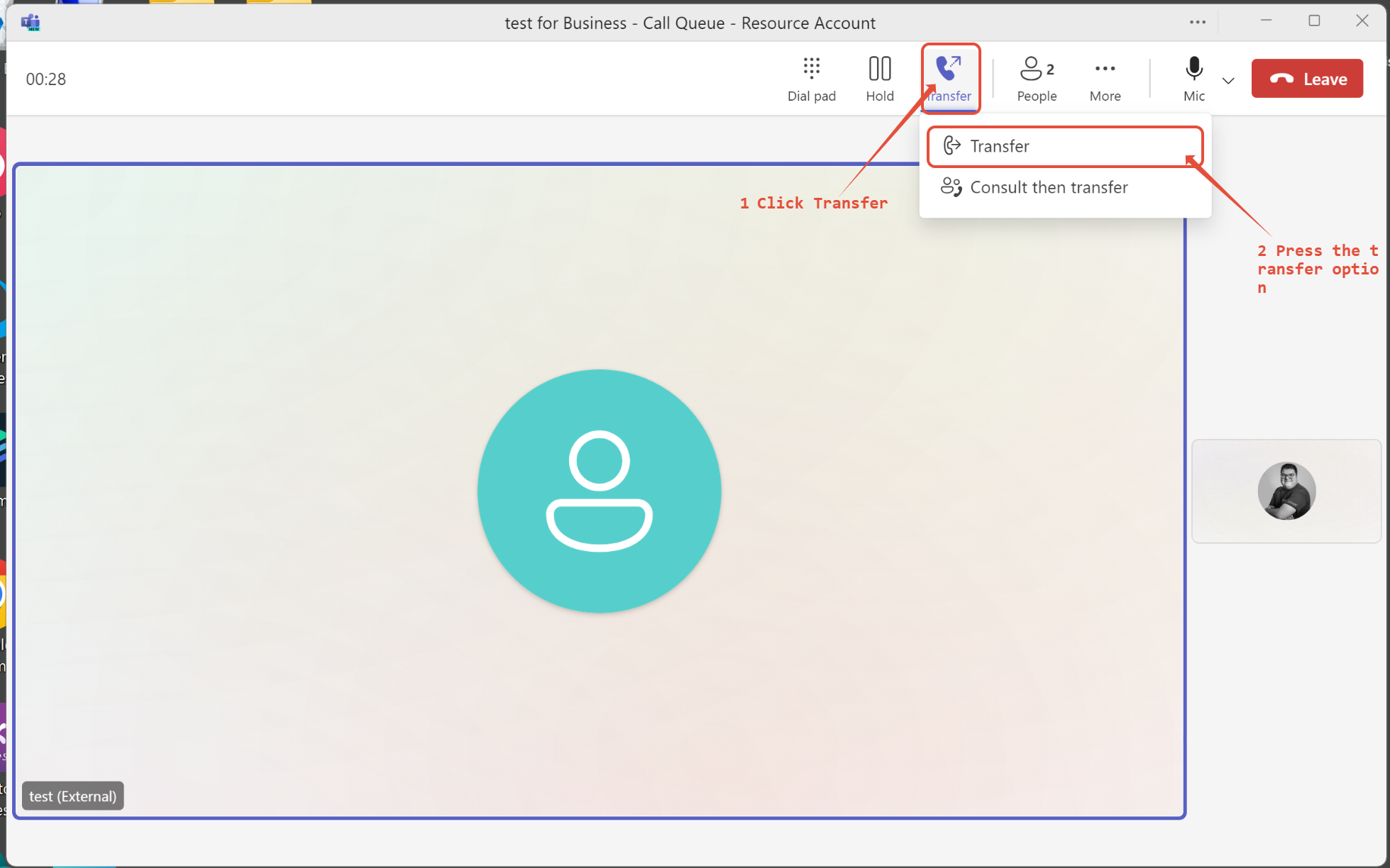 1) While in a call, you will see a few options at the top of the teams call window, one of which says transfer with a phone and arrow icon.