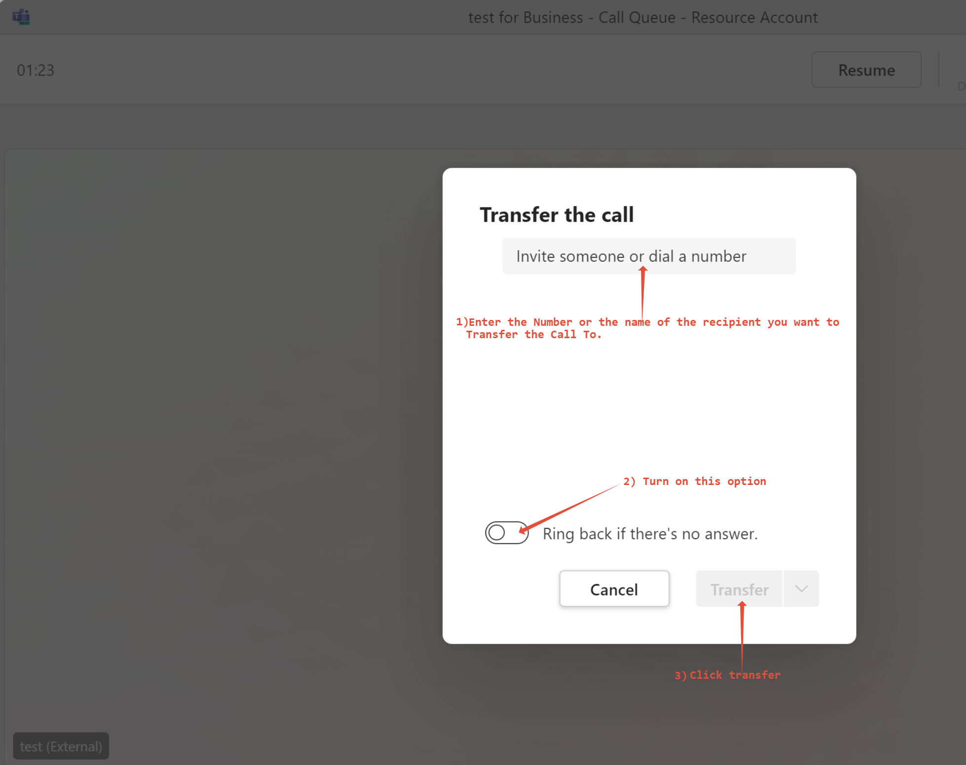 2) In the search box, type the persons contact name or number you would like to transfer to, then turn on the 'Ring back if there's no answer' option and click transfer.