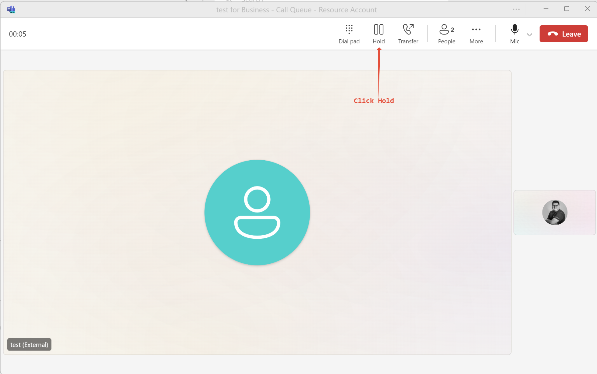 To place a call on hold, click the 'Hold' button located to the left of the transfer button at the top of the teams call window.