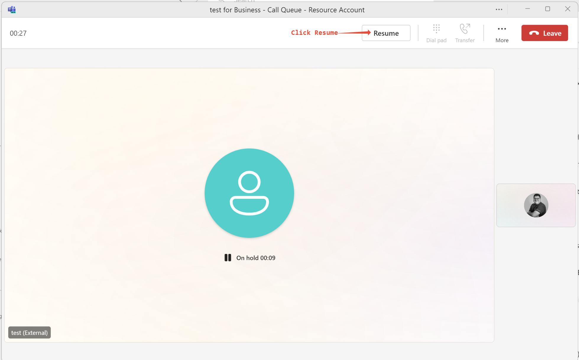 When you wish to resume the call, click the 'Resume' box at the top of the screen.
