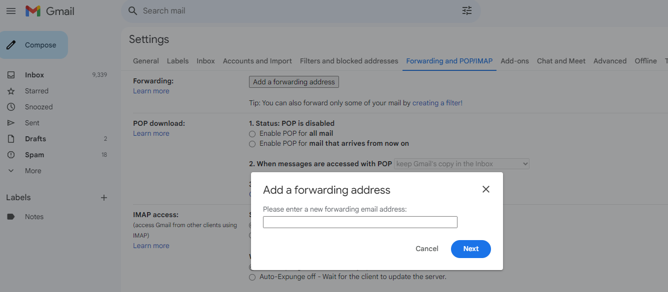 4) In the forwarding section, select Add a forwarding address. You can then enter the email address in which you would like to forward the emails to. Select Next.