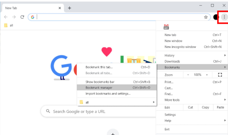 Then hover over Bookmarks, Bookmark Manager will appear, click on this.