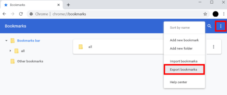 Once in Bookmark Manager click on the three vertical dots in the right hand corner.