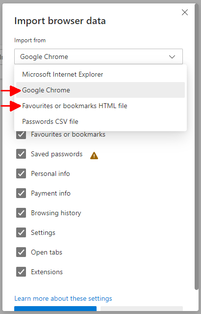 - If you have a bookmarks file, select 'Favourites or bookmarks HTML file'.