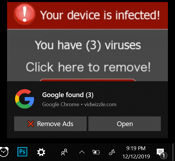 This is an article on what to do if you receive notifications similar to the one shown below. The first thing to notice is that the notification will say either Google Chrome or Edge in the notification and the website next to it. In this example the website is vidwizzle.com