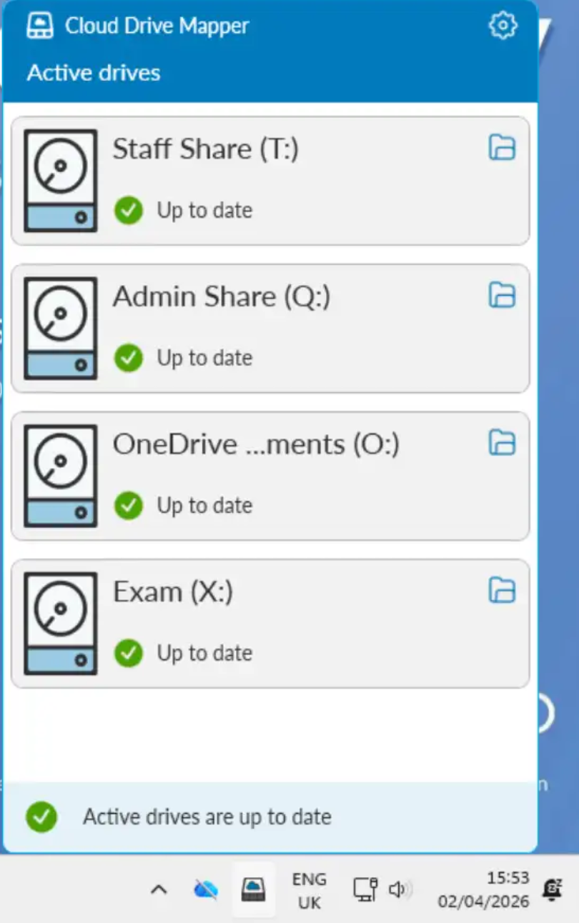 2. Left click the Cloud Drive Mapper icon and you are given a list of drives which are being mapped. (Yours may be named different dependent on school) If you are missing any drives which other colleagues have, let us know as we may need to check your permissions.