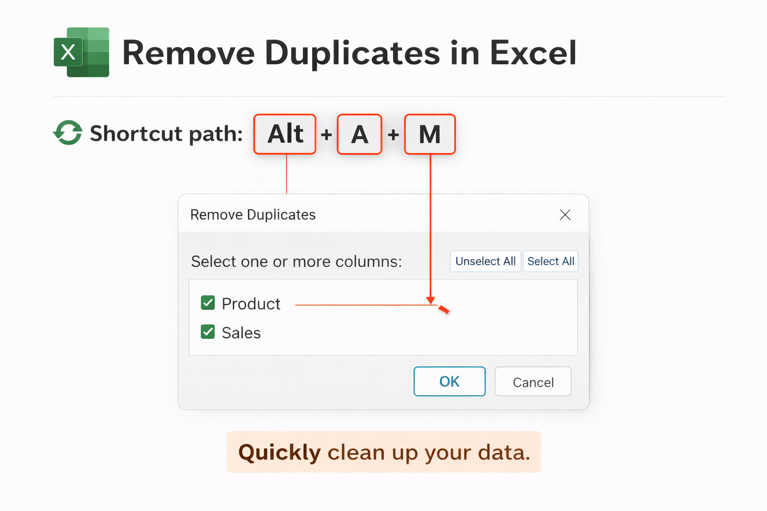 If you want a speedy way to remove duplicates then pressing "ALT+A+M" at the same time will instantly clean this up.