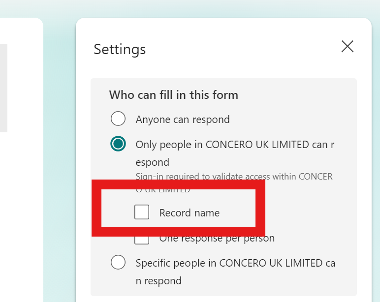 - Ensure that the option “Record name” is unchecked. If this option is not visible or already unchecked, it means the form is set to not record names.
