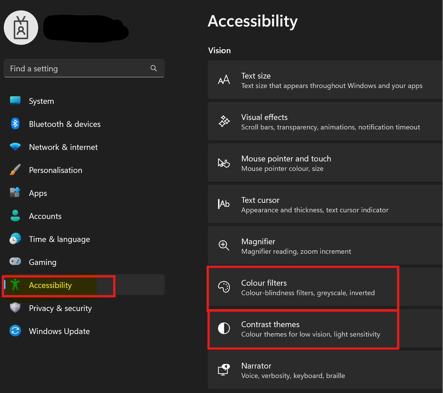 2. Choose 'Accessibility' and then go to 'Colour Filter' or 'Contrast Themes'