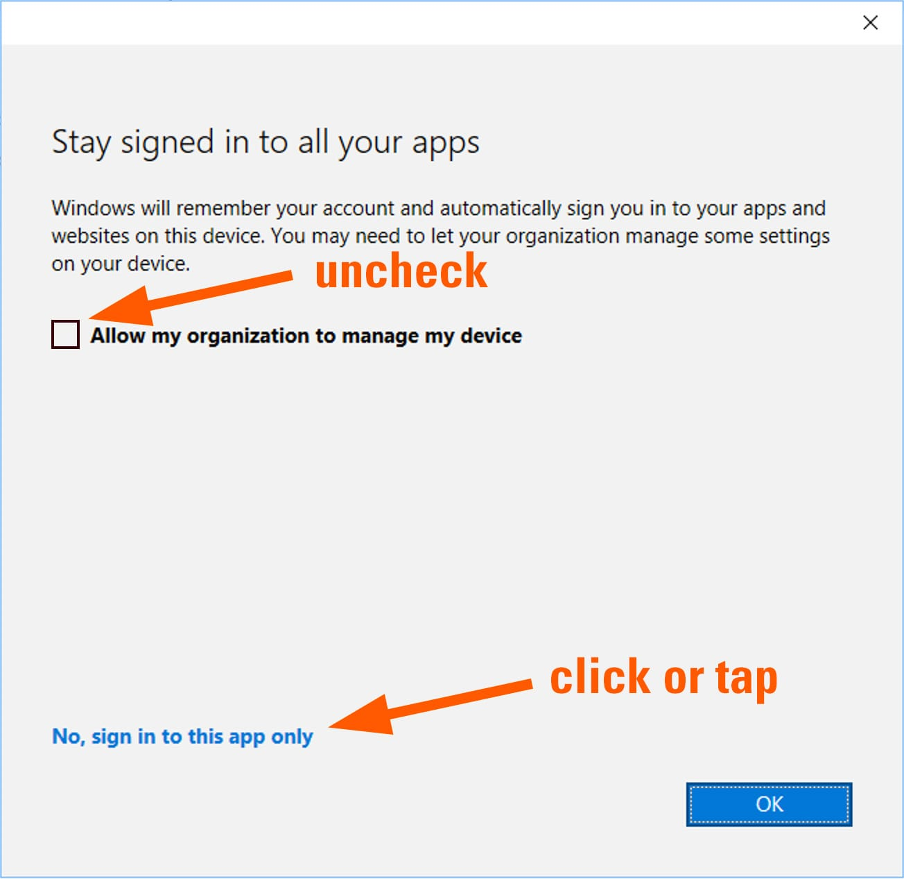 You will be asked to login with your school account, it's important if you are presented with the screen below on any device, you uncheck the box, and click to sign to this app only