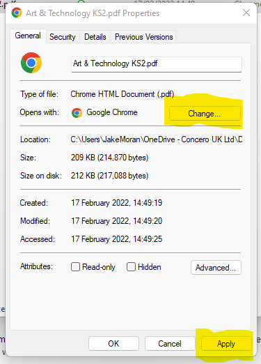 You should then select "change" and select the program which you wish to open the file type within. Once you have selected, don't forget to select "Apply", otherwise your selection will not save.