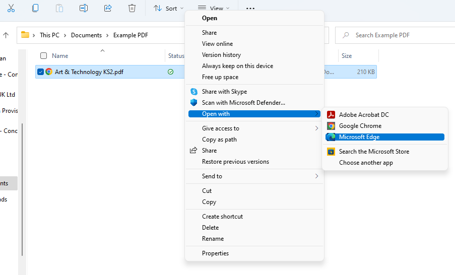 This article will explain how to change the default file type. An example of when you may wish to use this is when changing the program which you open PDFs in. The examples given are for a PDF but you may have a SMART file to select open with SMARTOpening as a one-time change: