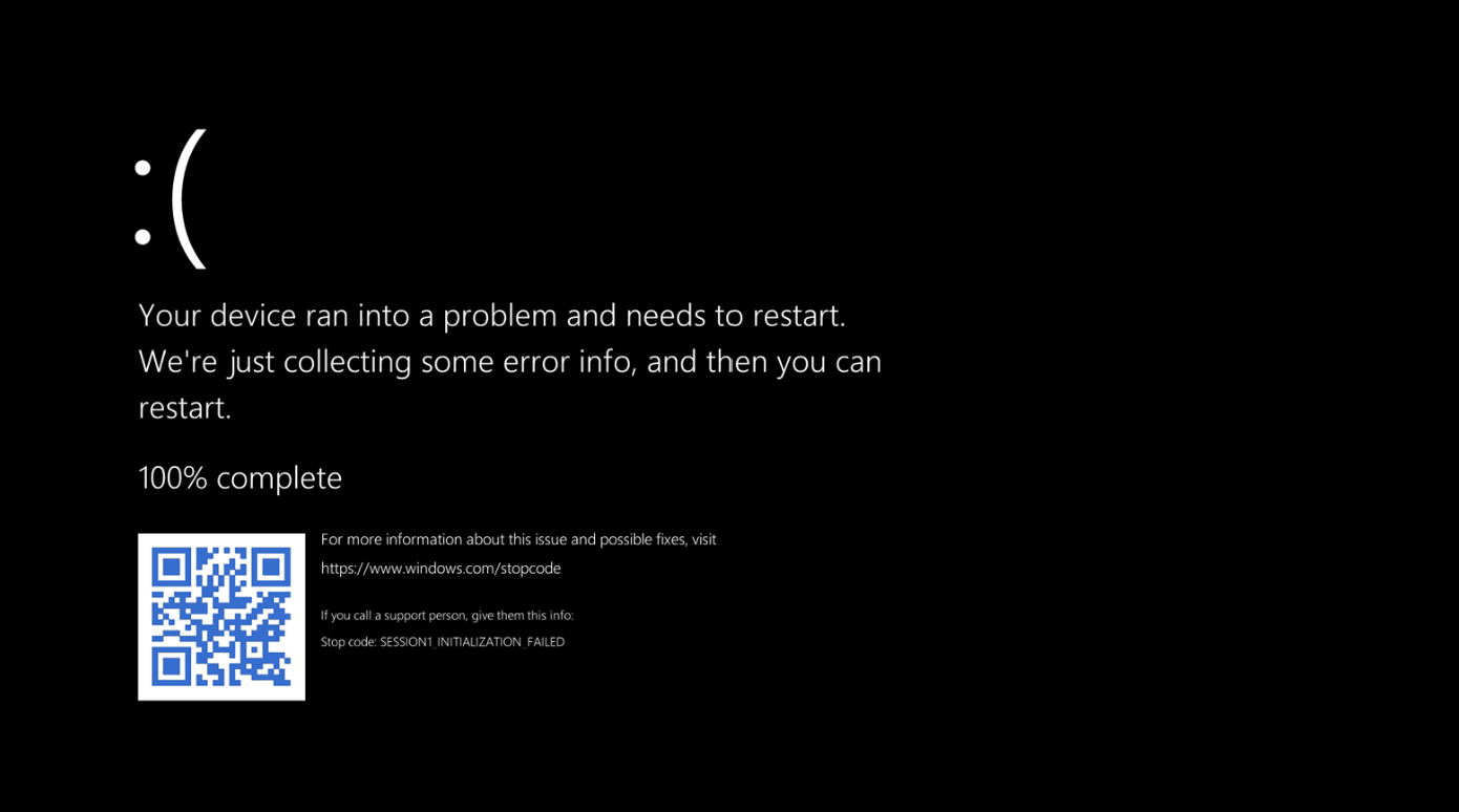 The term 'black screen' or 'black screen of death' refers to an error screen that can be displayed on all Windows machines where the system has encountered a fatal error state. This means that Windows cannot continue to run normally and so must restart the machine in order for normal functionality to resume. The below picture shows a typical black screen.
