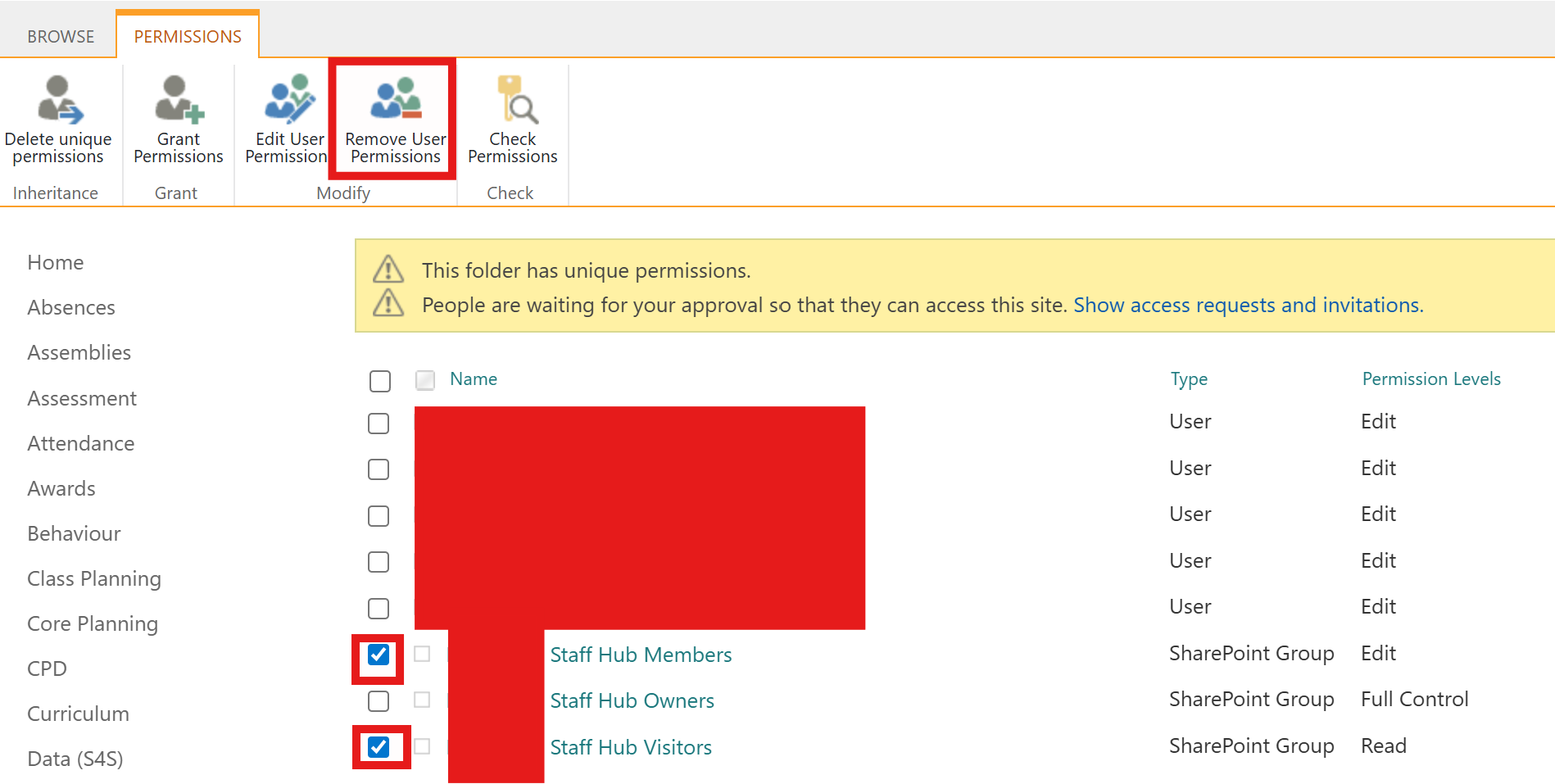 This article covers managing Sharepoint permissions within your Sharepoint site when you want them to be different to the default permissions of standard members. An example may be a safeguarding folder which is within Staff Share. You want your staff to access every folder within Staff Share, except the safeguarding one.