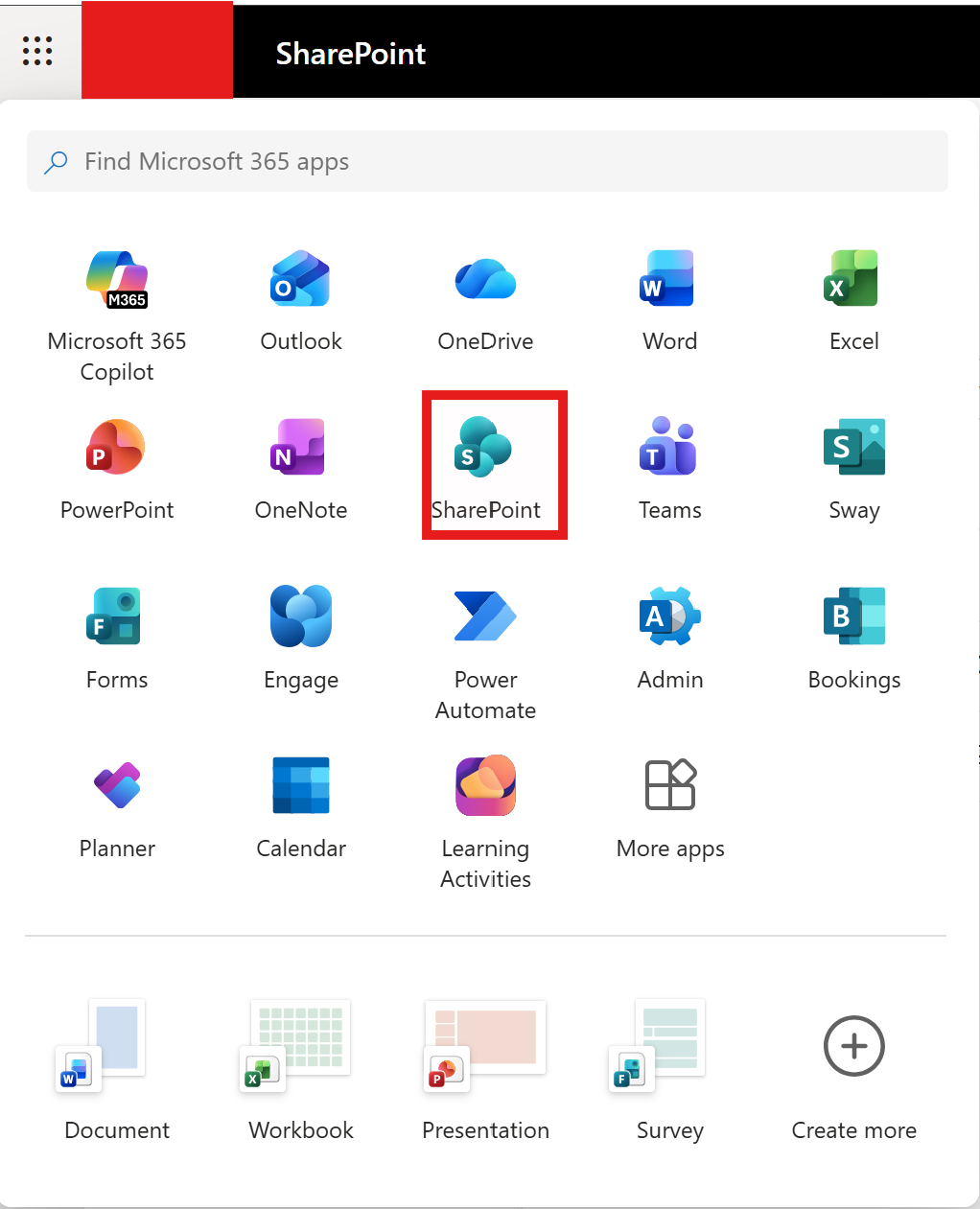 2) Open your specific Sharepoint by going to the waffle in the top left and select Sharepoint.