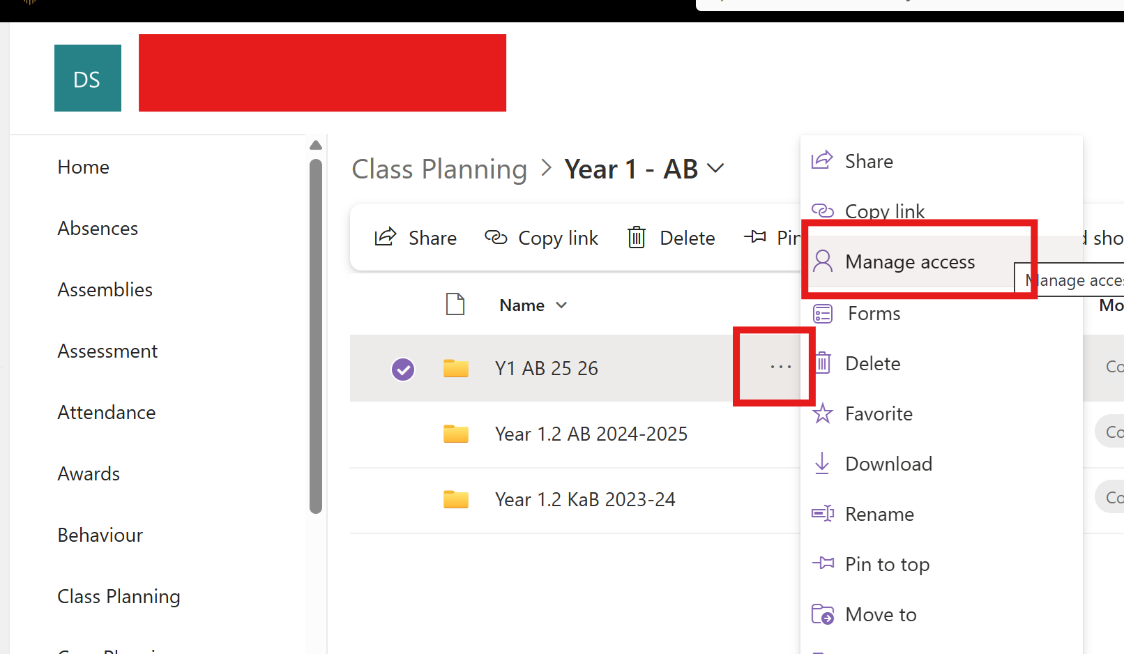 3) Navigate to the folder you wish to restrict access to. The below example would allow all members to access Class Planning -> Year 1 - AB but we are editing the permissions into Y1 AB 25 26