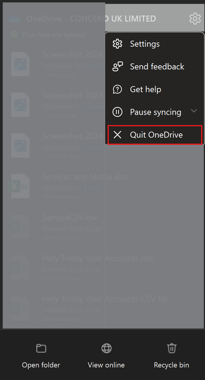 - Restart OneDrive Right-click the OneDrive icon in the system tray, select "Quit OneDrive", then reopen it from the Start menu.